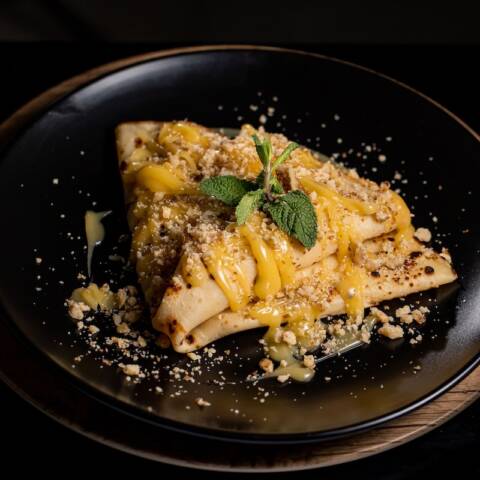 Cuib de bezea cu spuma de banane,curmale si sos caramel 120g